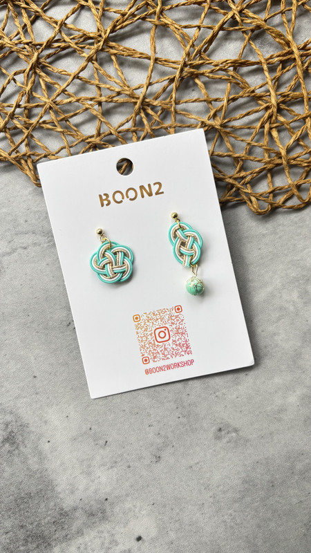 全人手製作的水引線耳環,配以保色金製成的配件,顏色柔和,適合不同場合。耳環梅結寬1.8cm,長2.4cm。耳環淡路結寬1.2cm,長3.8cm