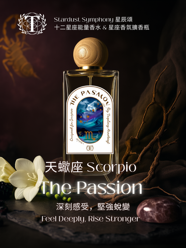 天蠍神秘強烈,擁有難以抗拒的吸引力,也背負著強烈情緒波動。 The Passion 以果香與夜花調展現性感張力,香根草如泥土般穩定情緒,平衡內在極端。 彩螢石清理負能量,強化直覺與內在力量,引導深層轉化與重生。 能量水晶|彩螢石:彩螢石|淨化情緒,強化直覺與思緒清晰,助轉化 前調 | 黑莓 中調 | 晚香玉 後調 | 秘魯香脂 ; 香根草 ; 麝貓香